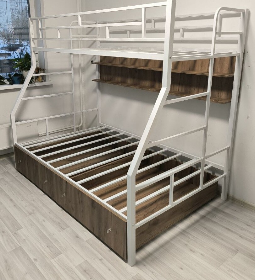 Двухъярусная кровать Раута Твист с ящиками и полкой белый дуб крафт табак выполнена из абсолютно безопасных, высокопрофессиональных и экологически чистых материалов. Для изготовления каркаса используется стальной прямоугольный профиль порошковой покраски. Используемая фурнитура качественная и надежная, все открытые части профиля скрыты специальными заглушками. Модель с увеличенным нижним спальным местом, комплектуется полкой и выкатными ящиками из ЛДСП.
