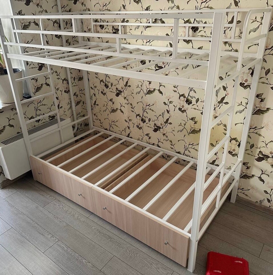Двухъярусная кровать Валенсия Твист с ящиками белый дуб молочный выполнена из абсолютно безопасных, высокопрофессиональных и экологически чистых материалов. Для изготовления каркаса используется стальной прямоугольный профиль порошковой покраски. Ящики выкатные на колесиках для хранения белья, игрушек - из ЛДСП. Используемая фурнитура качественная и надежная, все открытые части профиля скрыты специальными заглушками.