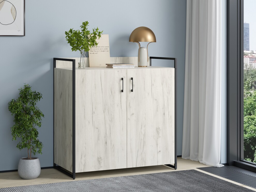 Комод Урбан Лофт 02 черный дуб крафт белый в виде распашного шкафа с полками для хранения, изготавливается из металлического прямоугольного профиля 20 на 20 мм, окрашенного порошковой краской и ЛДСП толщиной 16мм.