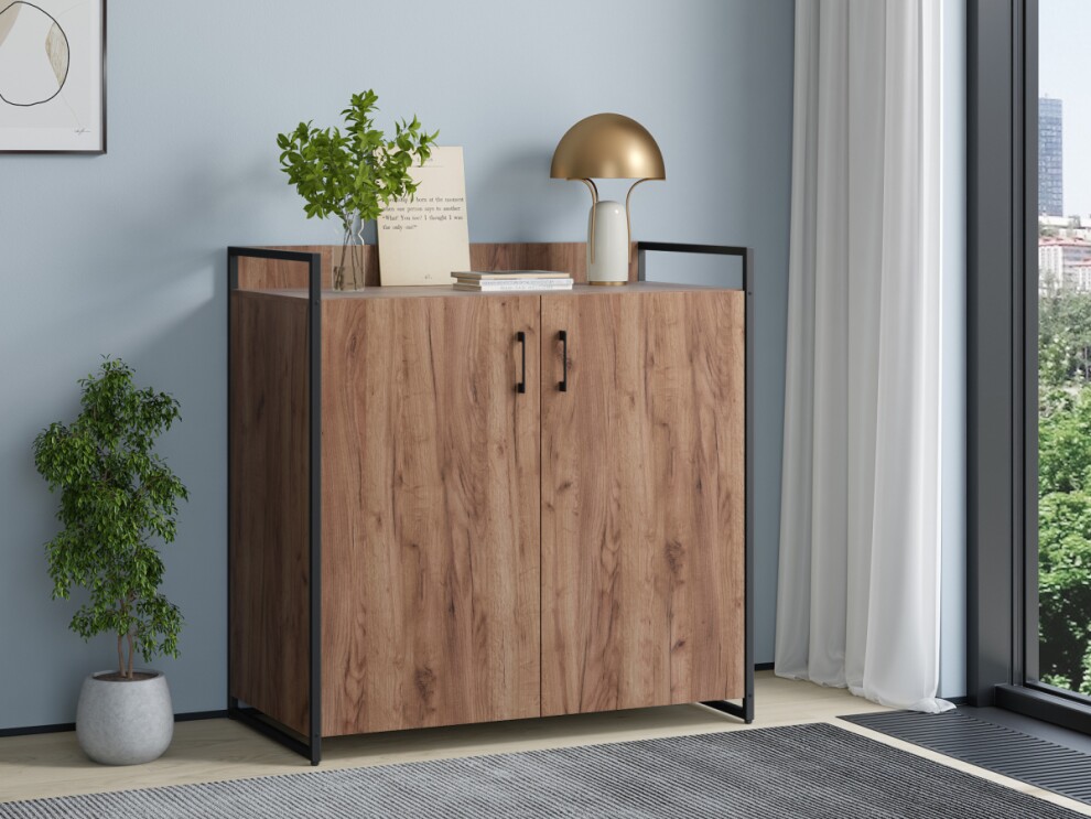 Комод Урбан Лофт 02 черный дуб крафт табак в виде распашного шкафа с полками для хранения, изготавливается из металлического прямоугольного профиля 20 на 20 мм, окрашенного порошковой краской и ЛДСП толщиной 16мм.