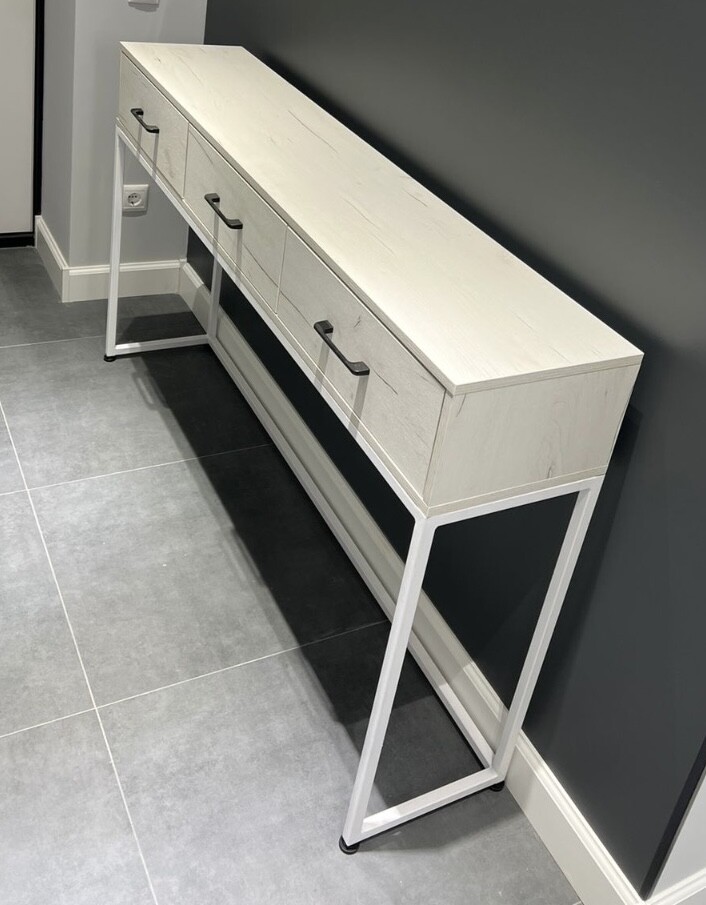 Консоль Айсберг Лофт 03 белый дуб крафт белый с ящиками изготавливается из стального прямоугольного профиля 20х20мм, покрытого порошковой краской, и ЛДСП 16мм. Все материалы высокого качества, экологически чистые и абсолютно безопасные. Опоры консоли регулируются по высоте.