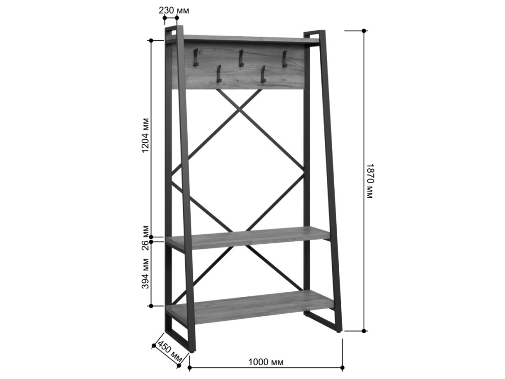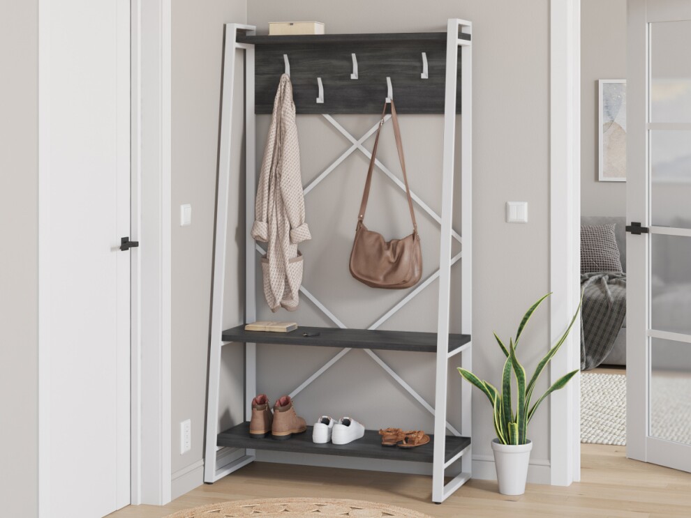 Прихожая Айсберг Лофт 100х187 белый северное дерево темное изготавливается из металлического прямоугольного профиля 40 на 20 мм толщиной 1,5мм, покрашенного порошковой краской и ЛДСП толщиной 26мм. Металлический каркас обеспечивает прочность и долговечность, а полки из ЛДСП добавляют уют за счет натуральной фактуры.