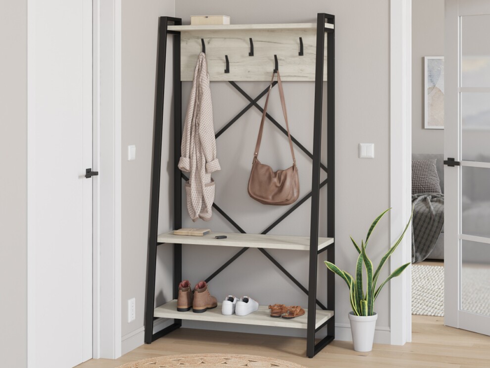 Прихожая Айсберг Лофт 100х187 черный дуб крафт белый изготавливается из металлического прямоугольного профиля 40 на 20 мм толщиной 1,5мм, покрашенного порошковой краской и ЛДСП толщиной 26мм. Металлический каркас обеспечивает прочность и долговечность, а полки из ЛДСП добавляют уют за счет натуральной фактуры.