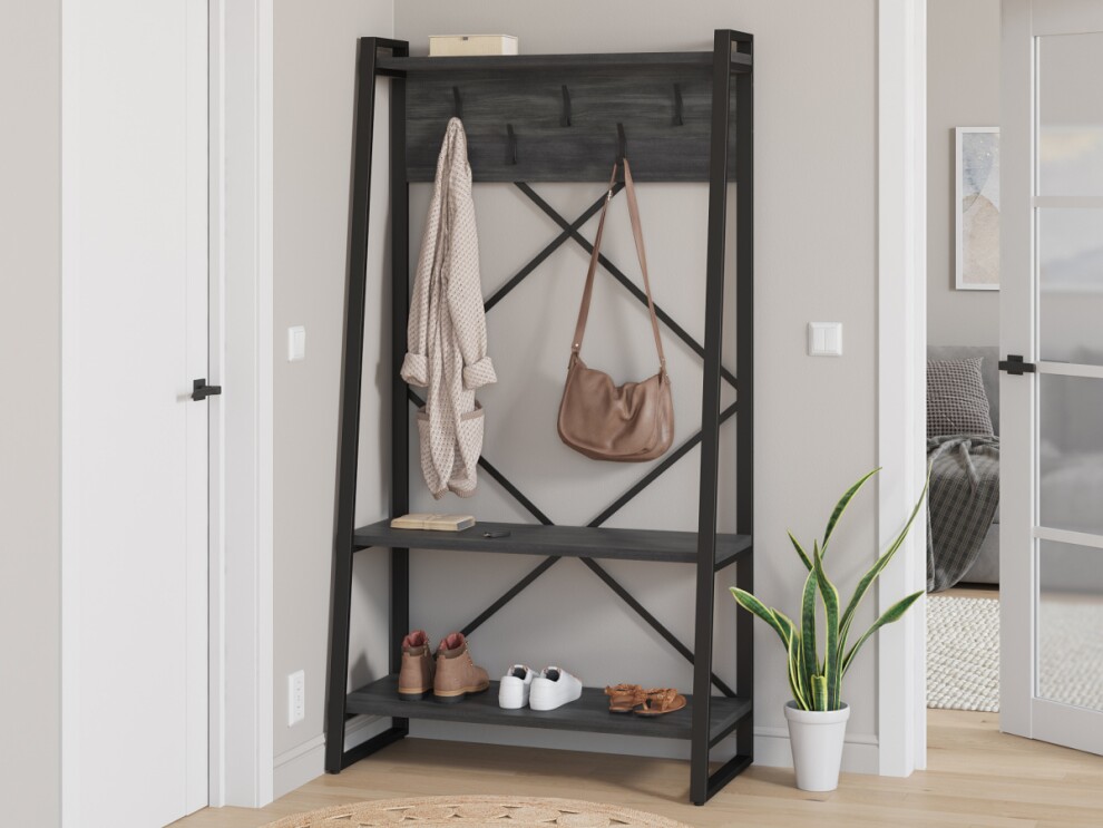 Прихожая Айсберг Лофт 100х187 черный северное дерево темное изготавливается из металлического прямоугольного профиля 40 на 20 мм толщиной 1,5мм, покрашенного порошковой краской и ЛДСП толщиной 26мм. Металлический каркас обеспечивает прочность и долговечность, а полки из ЛДСП добавляют уют за счет натуральной фактуры.